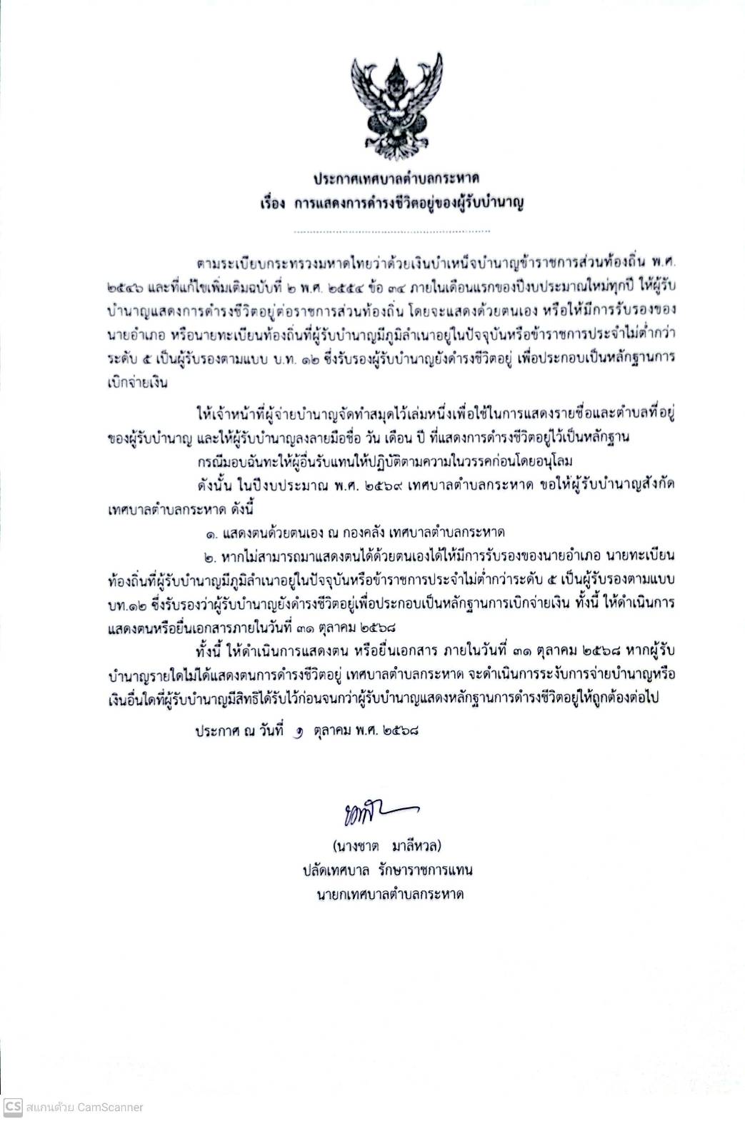 ประกาศเทศบาลตำบลกระหาด เรื่อง การแสดงการดำรงชีวิตอยู่ของผู้รับบำนาญ