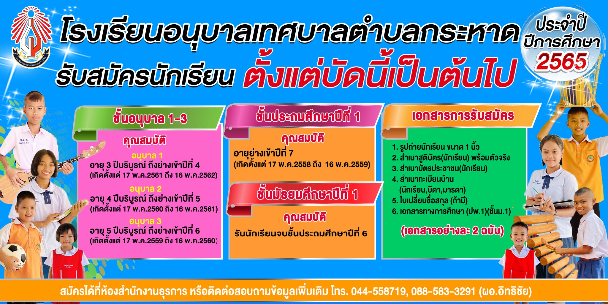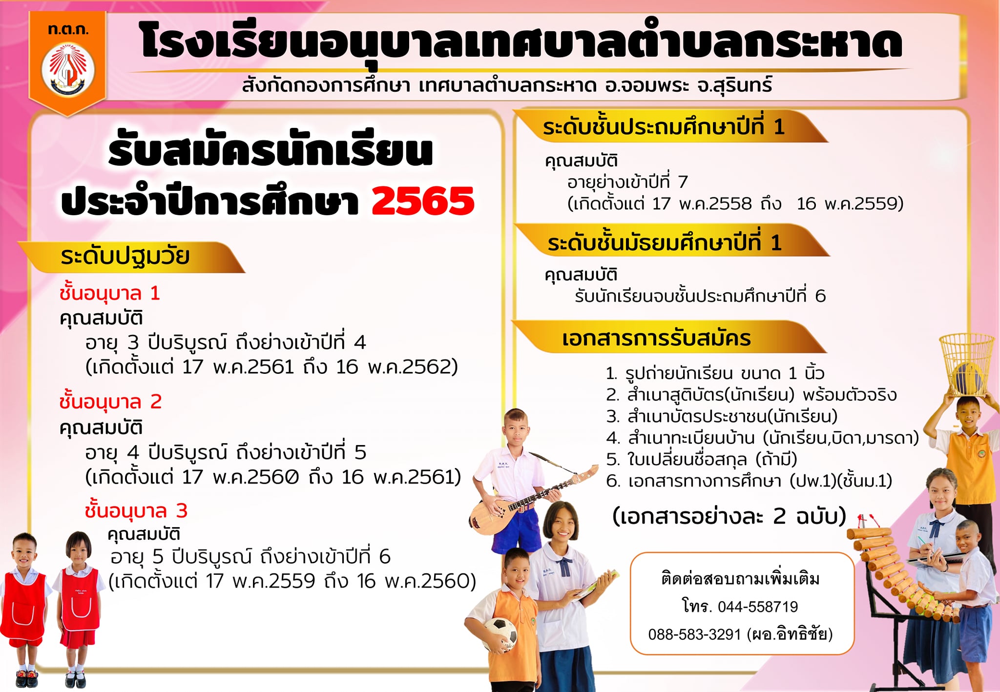 ประกาศรับสมัครนักเรียนเข้ารับการศึกษา โรงเรียนอนุบาลเทศบาลตำบลกระหาด ประจำปีการศึกษา 2565