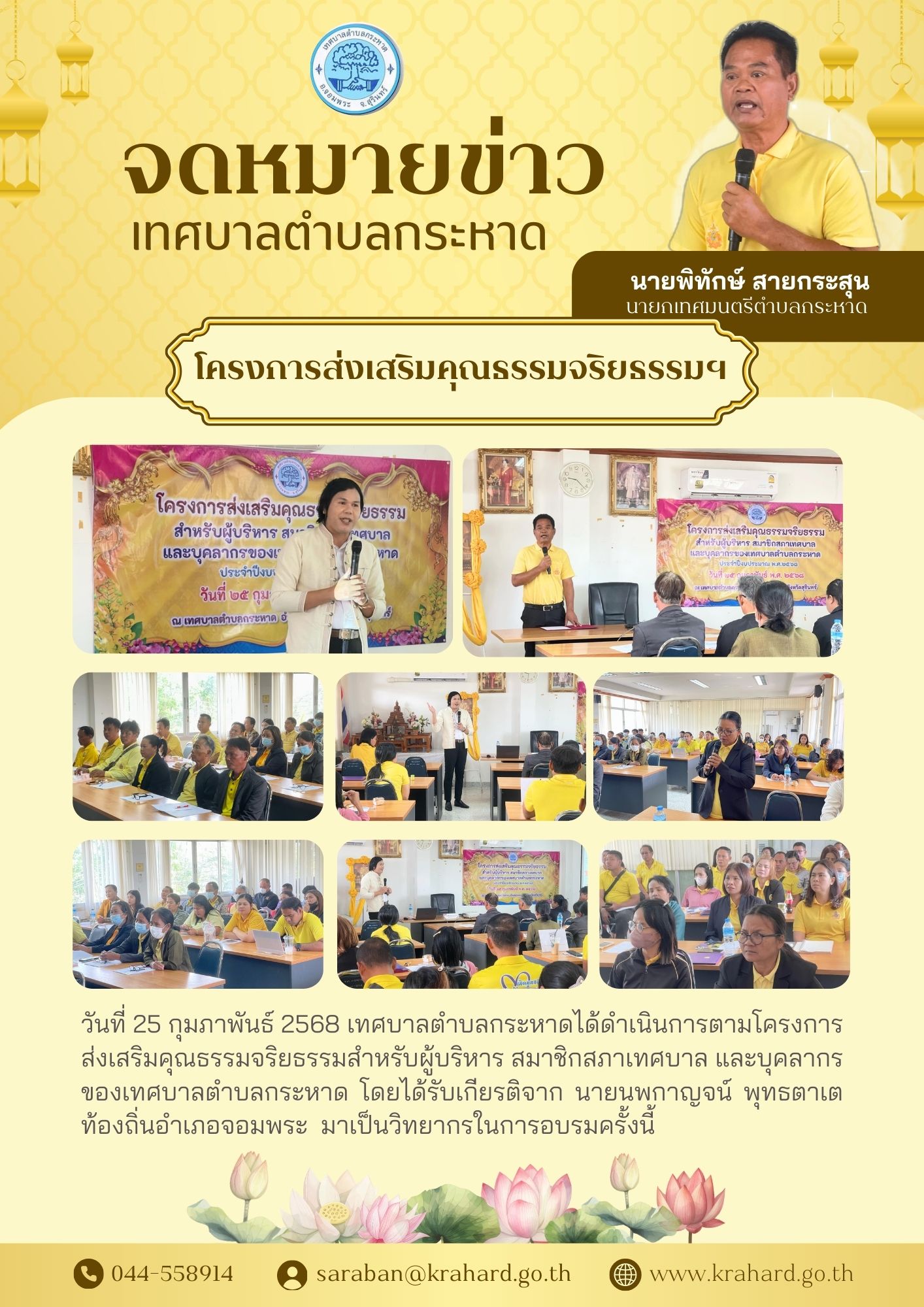 รายงานผลโครงการส่งเสริมคุณธรรม จริยธรรมผู้บริหาร สมาชิกสภาเทศบาล พนักงานเทศบาล และบุคลากรเทศบาลตำบลกระหาด ประจำปี พ.ศ. 2568