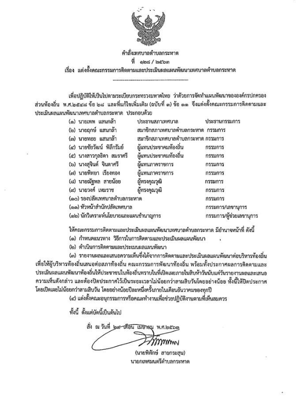 คำสั่งแต่งตั้งคณะกรรมการติดตามและประเมินผลแผนพัฒนาเทศบาลตำบลกระหาด