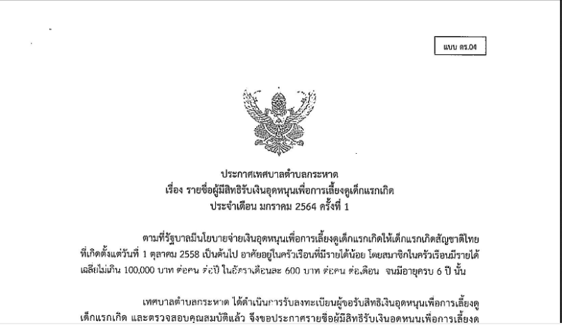 ประกาศเทศบาลตำบลกระหาด เรื่อง รายชื่อผู้มีสิทธิ์รับเงินอุดหนุนเพื่อการเลี้ยงดูเด็กแรกเกิด ประจำเดือนมกราคม 2564 ครั้งที่ 1