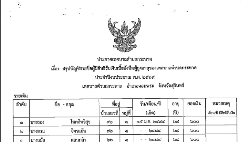 ประกาศเทศบาลตำบลกระหาด เรื่อง สรุปบัญชีรายชื่อผู้มีสิทธิรับเงินเบี้ยยังชีพผู้สูงอายุของเทศบาลตำบลกระหาด ประจำปีงบประมาณ พ.ศ.2564 (ต่อ2)