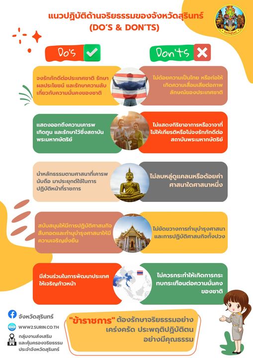 แนวทางปฏิบัติงานด้านจริยธรรมจังหวัดสุรินทร์ (Do's & Don'ts) เพื่อเป็นการสร้างความรู้ความเข้าใจเกี่ยวกับมาตรฐานทางจริยธรรมและส่งเสริมให้เจ้าหน้าที่ของรัฐ รักษาจริยธรรม ตามมาตรฐานทางจริยธรรม มีการประพฤติปฏิบัติอย่างมีคุณธรรม จังหวัดจึงได้จัดทำแนวทางปฏิบัติงานด้านจริยธรรม (Do's & Don'ts) ที่เข้าใจง่าย ชัดเจน สามารถนำไปใช้ในการปฏิบัติงานและปฏิบัติหน้าที่ได้อย่างเหมาะสม ช่วยลดความเสี่ยงจากการที่เจ้าหน้าที่ของรัฐมีพฤติกรรมที่เป็นการฝ่าฝืนมาตรฐานทางจริยธรรมหรือประมวลจริยธรรม อีกทั้งเป็นการป้องกันปัญหาการขัดกันระหว่างผลประโยชน์ส่วนตนกับส่วนรวม การทุจริตและประพฤติมิชอบในหน่วยงานของรัฐ โดยมีแนวปฏิบัติฯ ดังนี้