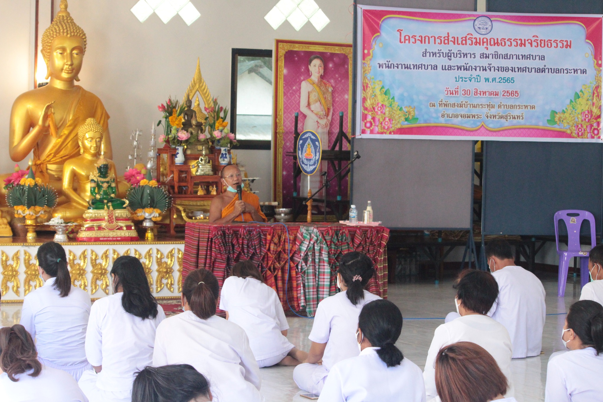 เทศบาลตำบลกระหาด ดำเนินโครงการส่งเสริมคุณธรรม จริยธรรม สำหรับผู้บริหาร สมาชิกสภาเทศบาล พนักงานเทศบาล พนักงานจ้างของเทศบาลตำบลกระหาด ประจำปีงบประมาณ 2565 เมื่อวันที่ 30 สิงหาคม 2565 ณ ที่พักสงฆ์บ้านกระทุ่ม ตำบลกระหาด อำเภอจอมพระ จังหวัดสุรินทร์ เพื่อสนับสนุนและส่งเสริมให้บุคลากรของเทศบาลตำบลกระหาดมีความรู้ ความเข้าใจ และสามารถนำหลักธรรมทางพระพุทธศาสนามาประยุกต์ใช้ในชีวิตประจำวัน และการปฏิบัติราชการให้มีประสิทธิภาพและประสิทธิผล เกิดประโยชน์ต่อตนเอง องค์กรและชุมชนต่อไป